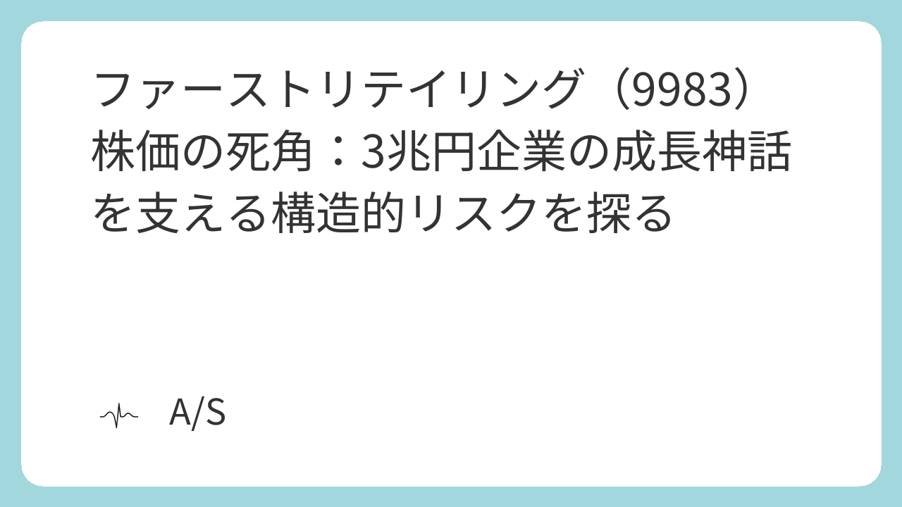 この記事のキーワード:ファーストリテイリング, 株価, ユニクロ, 経営分析, LifeWear, 柳井正, 後継者問題, サプライチェーン, デジタル変革, 有明プロジェクト, ZARA, SHEIN, H&M, 競合分析, 成長戦略, リスク分析, 日経平均株価, 寄与度