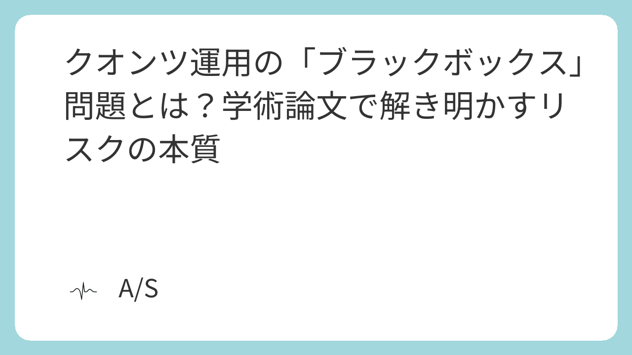 この出来事は、ブラックボックスモデルが内包する「モデルリスク」、すなわちモデルの前提や構造そのものがリスク源となり得ることを市場に強く認識させました [2]。本記事では、このクオンツ運用のブラックボックス問題とは何か、なぜそれが危険なのか、そして私たちはこの問題にどう向き合うべきなのかを、学術的な研究を基に解き明かしていきます。