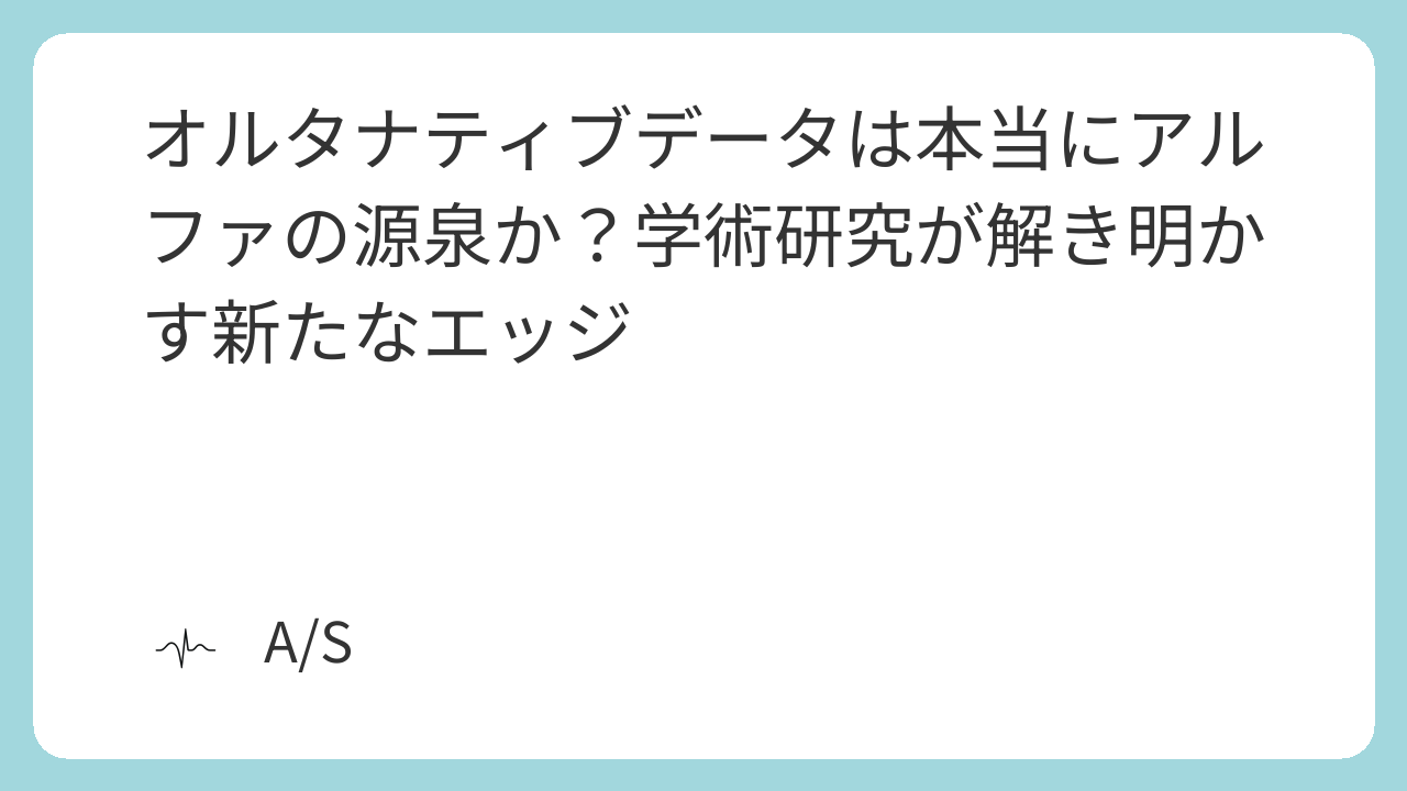 これらのデータは、伝統的データよりも速く、あるいは異なる角度から経済活動の実態を捉えることができると期待されています。では、オルタナティブデータは本当に、市場平均を上回るリターン(アルファ)を生み出すための信頼できる源泉となり得るのでしょうか。この問いに対して、幸いなことに私たちは学術研究の形で蓄積された多くの知見に頼ることができます。例えば、ニュース記事の論調が持つ悲観的な内容が、その後の株価の下落を予測する力を持つことを示した研究が存在します [1]。また、特定の企業名がインターネットで検索される頻度の急増が、その後の株価変動の予兆となり得ることも明らかにされています [2]。